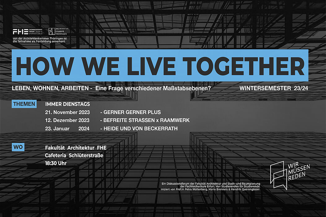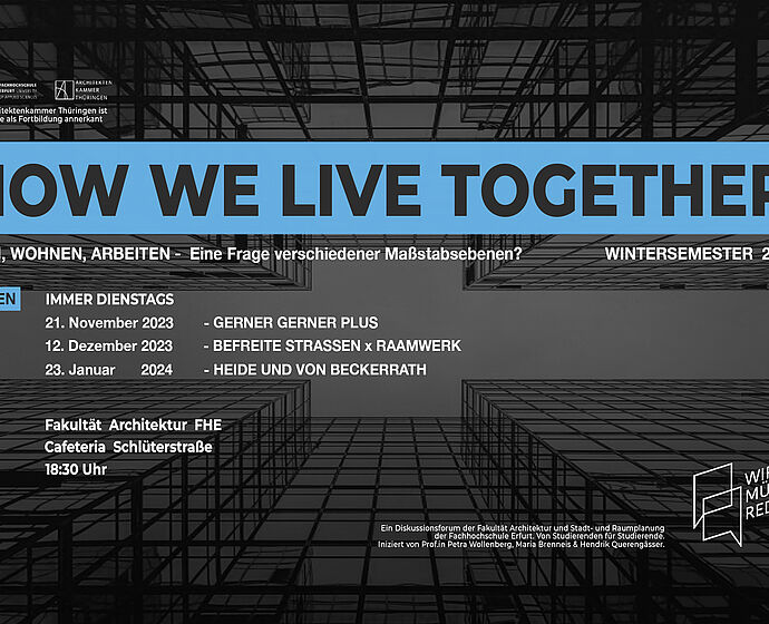 In unserer Diskussionsreihe wollen wir uns in diesem Semester mit dem Thema “How we live together // Leben, Wohnen, Arbeiten - Eine Frage unterschiedlicher Maßstabsebenen?” auseinandersetzen. Dazu möchten wir mit wichtigen Protagonist*Innen über Themenkomplexe diskutieren, wie auch in deutschland sich sozialer Wohnungsbau verändern kann und sollte und wie wir als angehende Architekt*innen dies beeinflussen.