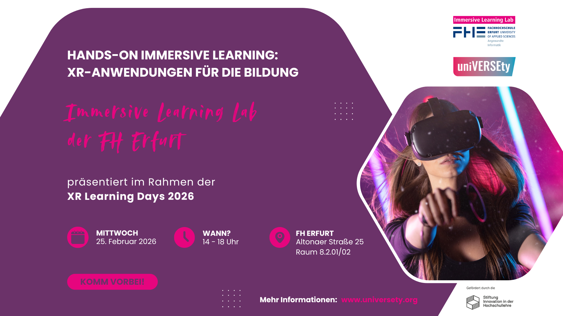 Im Rahmen der XR Learning Days 2026 findet am 25.02.2026 von 14:00 - 18:00 Uhr die praxisorientierte Veranstaltung "Hands-On Immersive Learning: XR-Anwendungen für die Bildung" statt (Raum 8.2.01/02). Die Session bietet eine kompakte Einführung in aktuelle XR-Projekte des Immersive Learning Lab der Fachhochschule Erfurt sowie Einblicke in das Hochschulnetzwerk uniVERSEty. Im Mittelpunkt steht eine ausführliche Hands-On-Phase, in der verschiedene XR-Anwendungen - u. a. eine Demo des Mixed-Reality-Projekts "Inside Germany" - selbst ausprobiert werden können. Eine gemeinsame Reflexion rundet die Veranstaltung ab und ermöglicht Austausch über Einsatzmöglichkeiten von XR in Bildungskontexten.