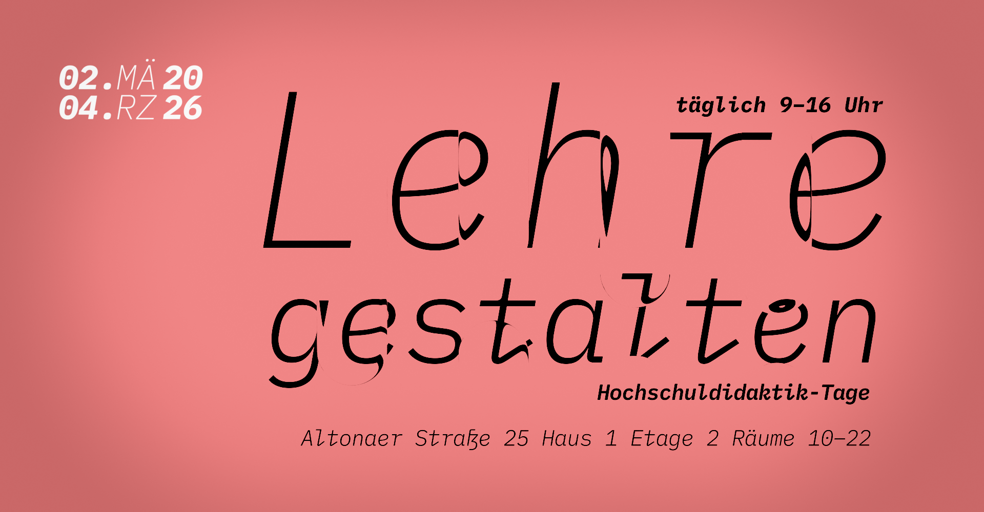 Vom 02. bis 04. März 2026 (Montag bis Mittwoch) jeweils von 9 bis 16 Uhr hat das Hochschuldidaktik Team für alle Lehrenden praxisnahe Workshops und Vorträge sowie Austauschmöglichkeiten organisiert. Sie können sich zu folgenden Themen Impulse holen: Nachhaltigkeit, Diversität, Hochschuldidaktik, Visualisierung, virtuelle Räume und KI.