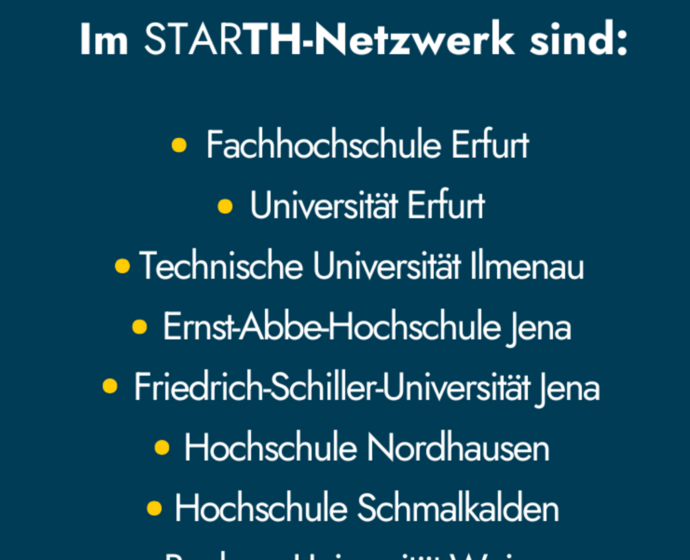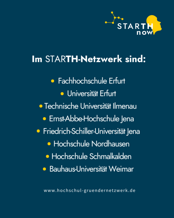 Das Thüringer Hochschulgründungsnetzwerk „StarTH“ vereint die Gründungskompetenz der Thüringer Hochschulen. Gemeinsam wird Gründer:innen ein einzigartiges Netzwerk, inspirierende Events und Zugang zu Expertenwissen geboten. Mehr Informationen über den Workshop-Reihe finden Sie hier StarTH NOW.