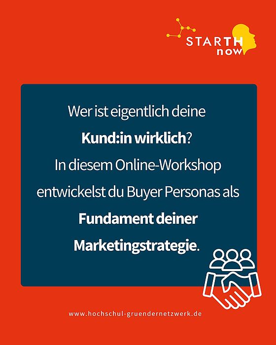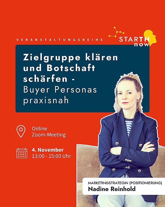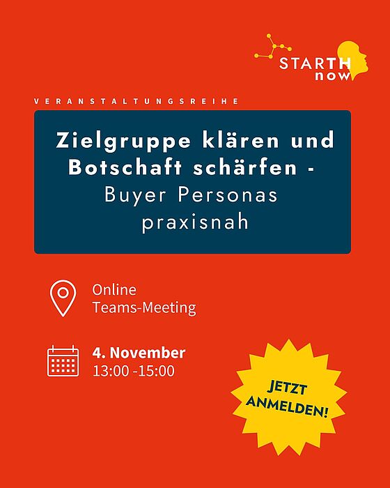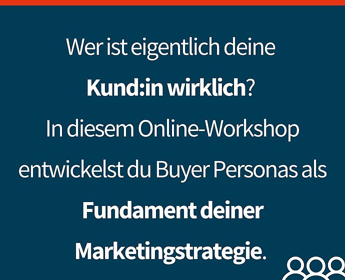 In diesem Online-Workshop entwickeln Sie Buyer Personas als Fundament Ihrer Marketingstrategie. Sie erfahren, warum die Arbeit mit Zielgruppen nicht einfach ein „Nice-to-have“ ist, sondern der erste und wichtigste Schritt im Gründungsprozess.