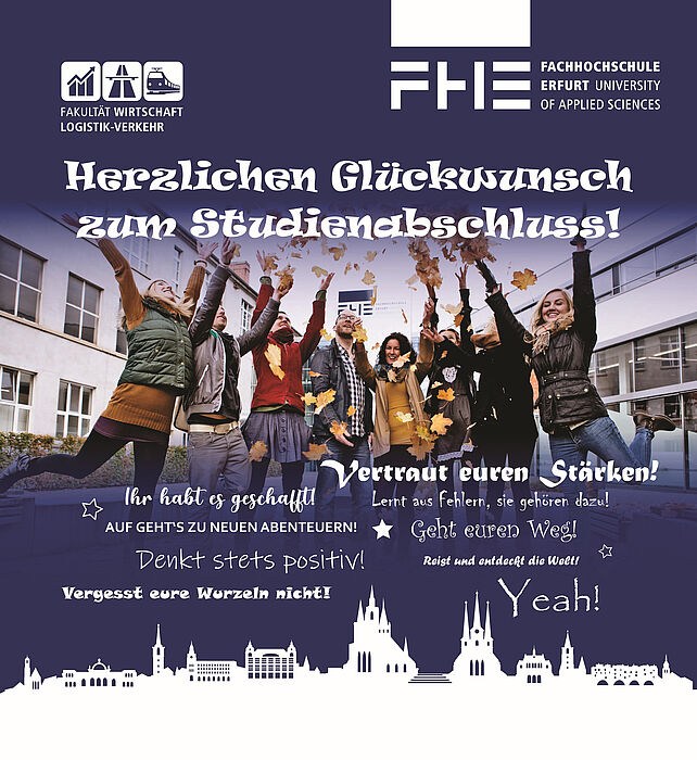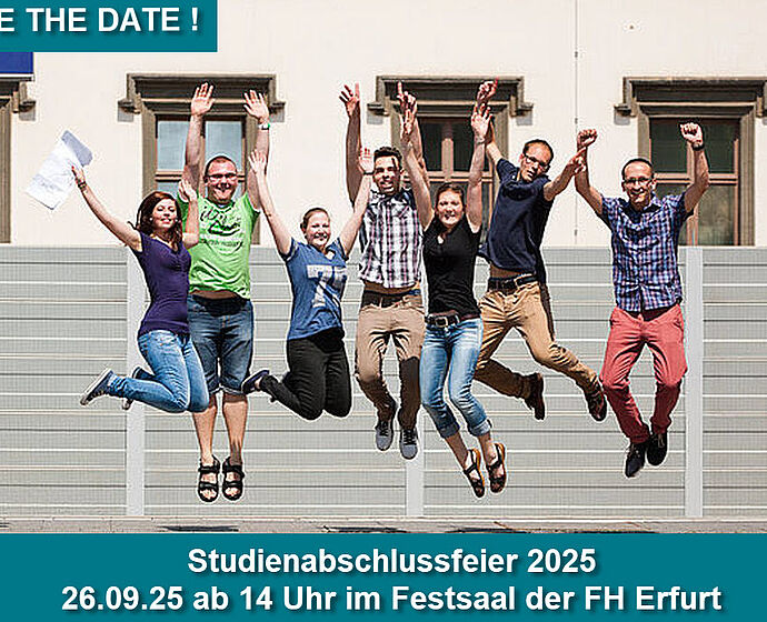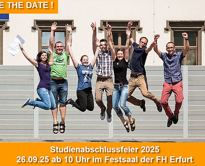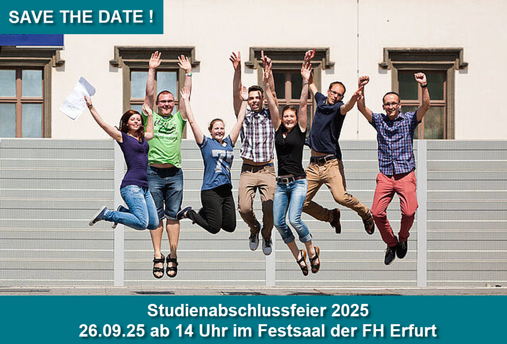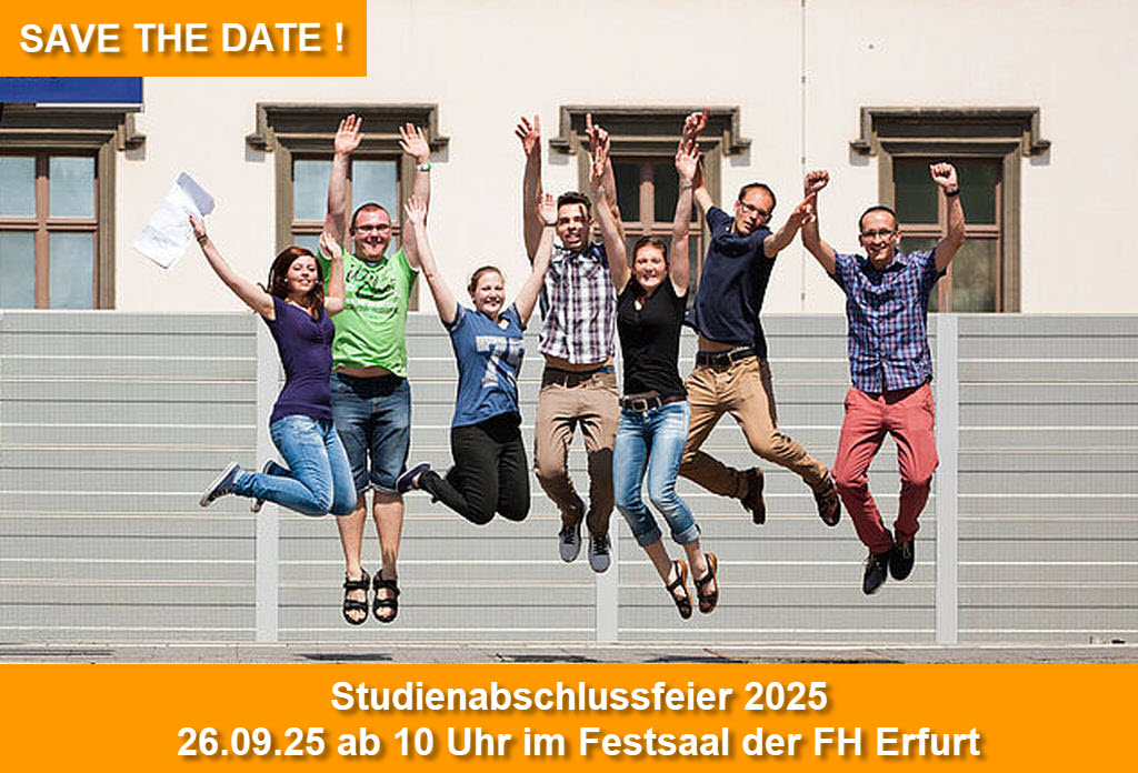 Am 26.09.2025 findet im Festsaal der FH Erfurt die Studienabschlussfeier mit feierlicher Zeugnisübergabe unserer diesjährigen Absolventinnen und Absolventen statt.
