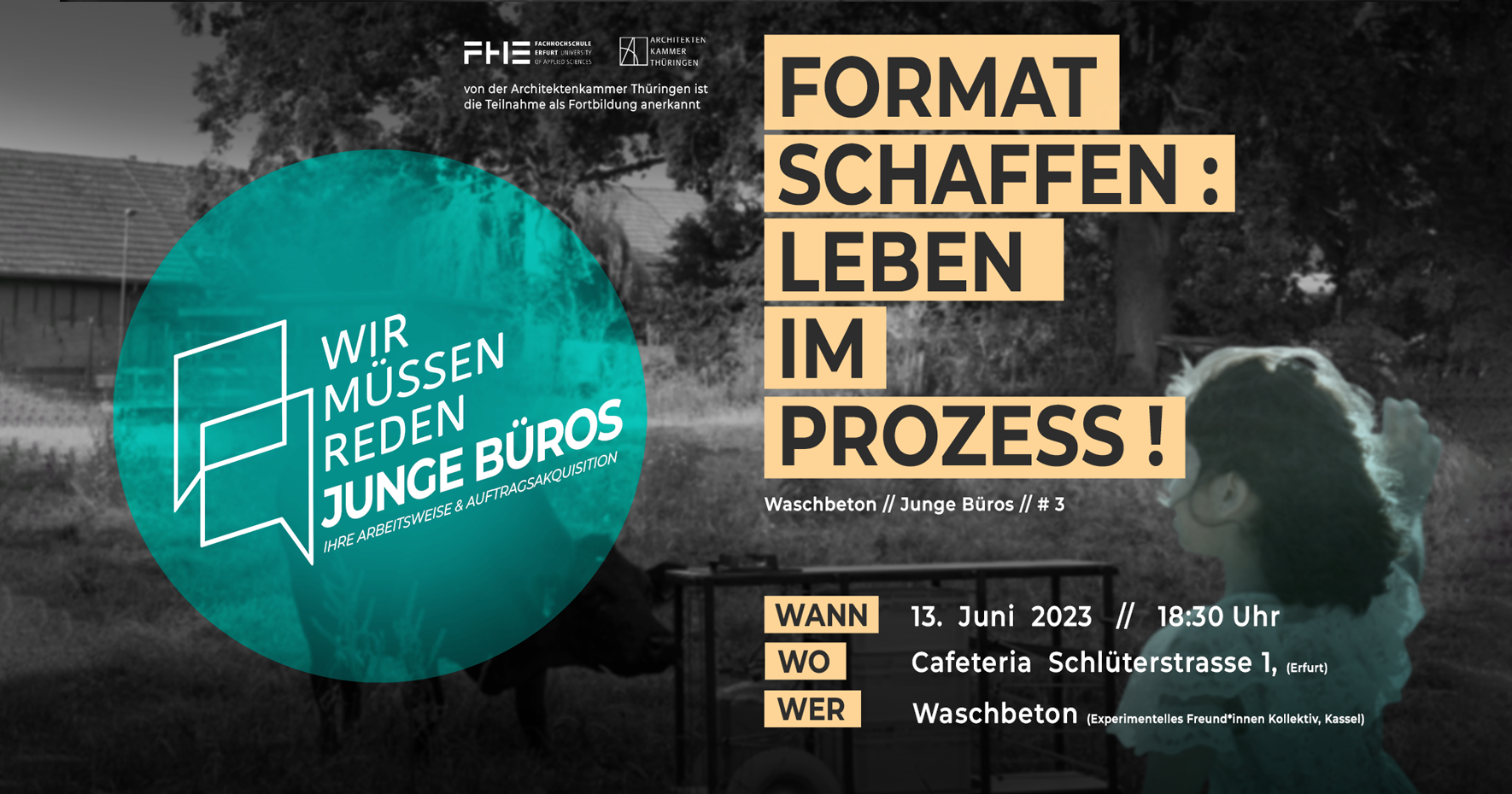 Zu Gast bei dieser Veranstaltung ist das Kollektiv Waschbeton aus Kassel. Wir wollen zusammen Ihre Anfänge, Projekte und Tipps für junge Architekt:innen besprechen. Außerdem laden wir euch ein, mit uns zu diskutieren, wie die gewonnenen Erkenntnisse weitergetragen und entwickelt werden können.