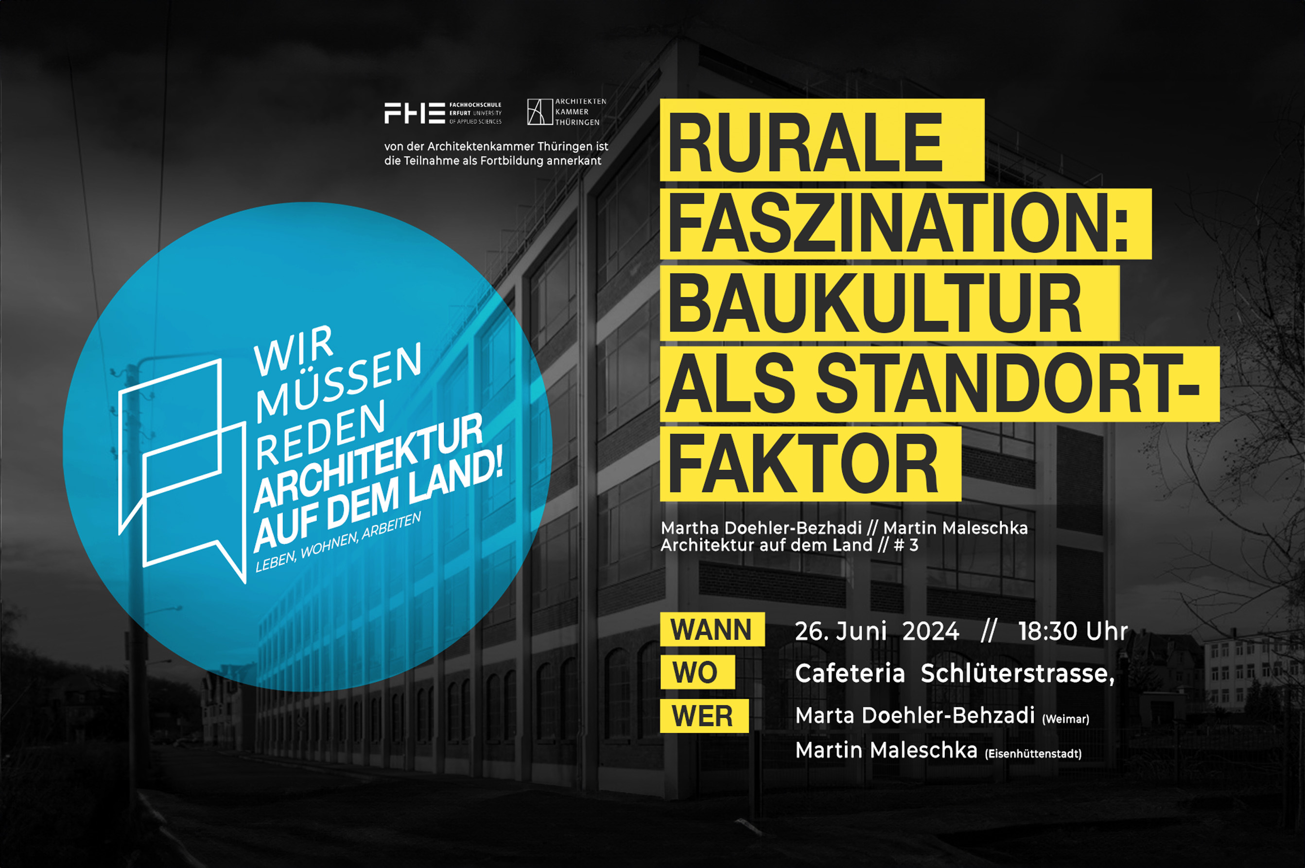 Zu Gast bei dieser Veranstaltung sind die beiden Protagonist:innen Marta Doehler-Behzadi und Martin Maleschka. Wir wollen zusammen über Ihre Arbeit im ruralen Raum und in der Architektur , Sicht auf das ländliche Potenzial, Projekte und Möglichkeiten im Bezug zum ländlichen Raum und dessen verschiedene Maßstäbe, Herausforderungen und Chancen besprechen. Außerdem laden wir euch ein, mit uns zu diskutieren, wie die gewonnenen Erkenntnisse weitergetragen und entwickelt werden können.