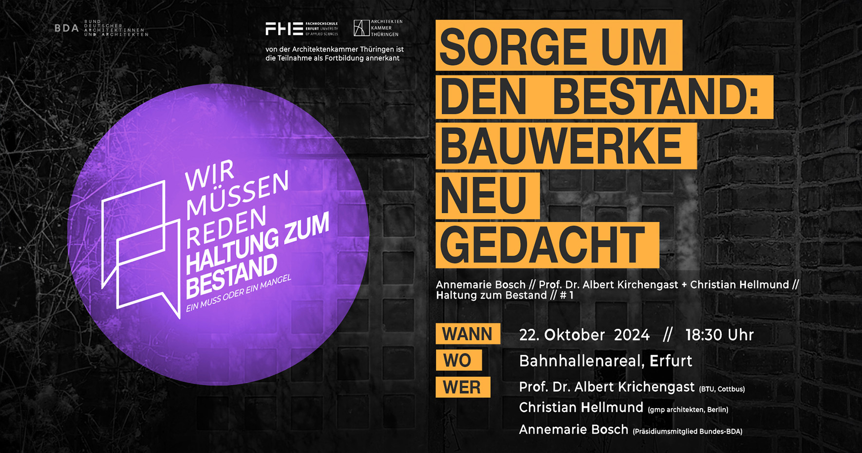 Zu Gast bei dieser Veranstaltung sind: Annemarie Bosch (Präsidiumsmitglied Bundes-BDA), Prof. Dr. Albert Kirchengast (Juniorprofessor Architekturtheorie, BTU Cottbus-Senftenberg) und Christian Hellmund (Partner, Architekten von Gerkan, Marg und Partner). Uns interessiert, welche Potentiale und Herausforderungen unsere Gäst:innen im Umgang mit dem Bestand sehen, wie z.B. leichtfertiger Abriss verhindert werden kann, welche Prämissen sie in ihren architektonischen Umbauprojekten verfolgen und wie diese Themen in der Ausbildung von zukünftigen Architekt:innen verankert werden müssen.