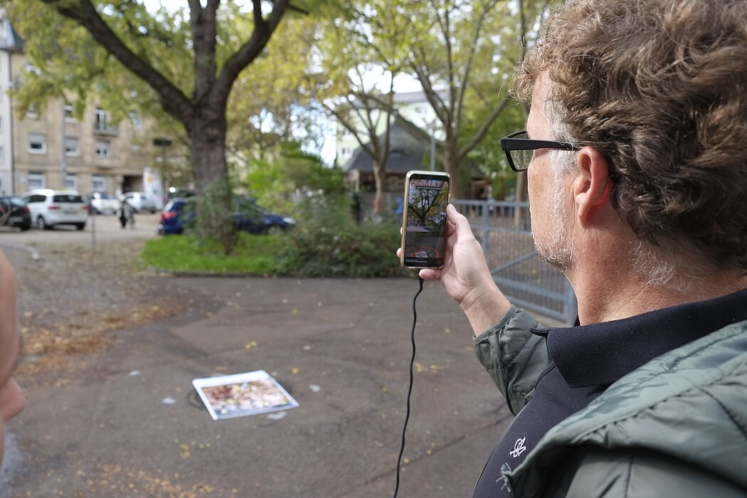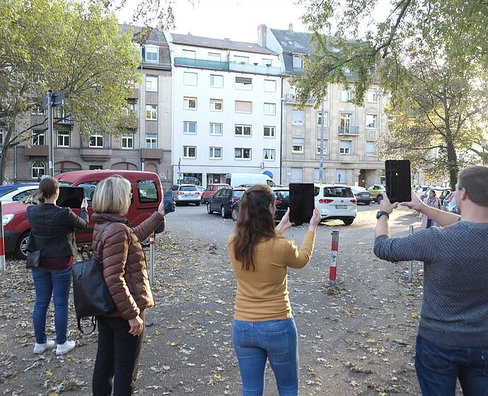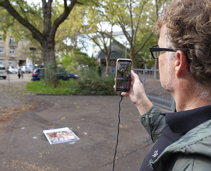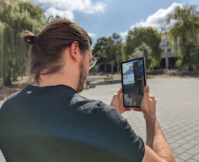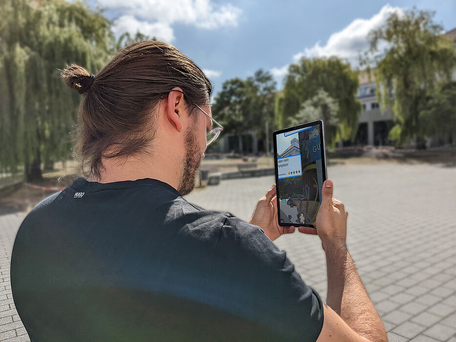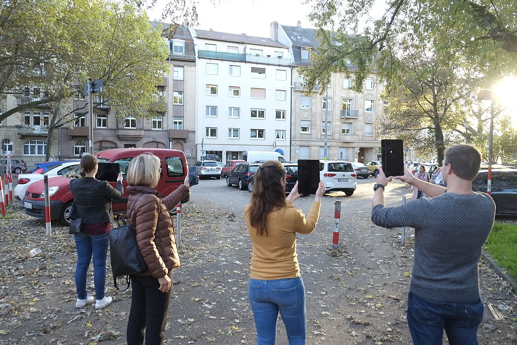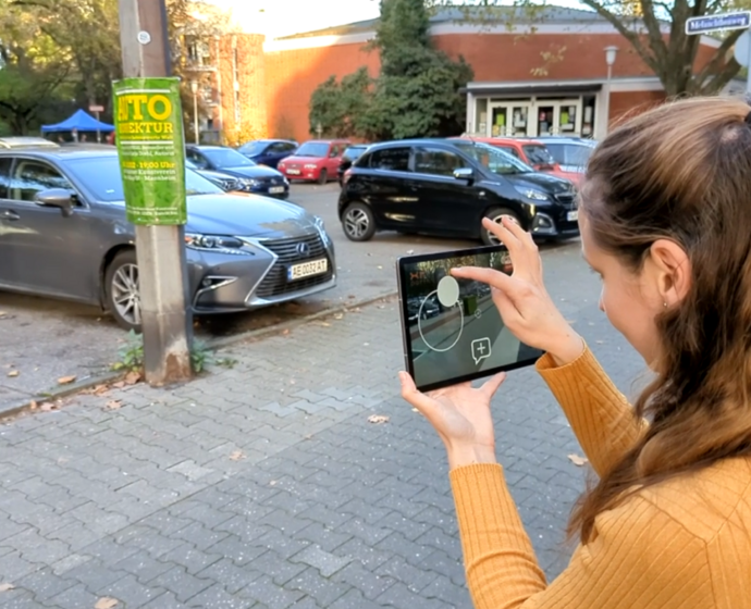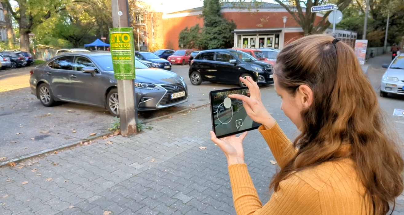 Augmented Reality: Virtuelle Objekte (hier besonders: Gebäude, Stadtmöbel, Straßen, Bäume) werden im realen Stadtraum erlebbar.