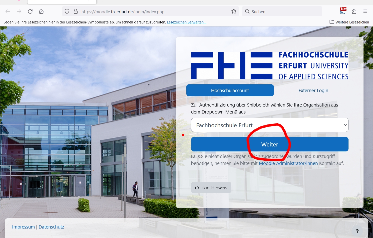 Hier wählen Sie Ihre Heimateinrichtung, "Fachhochschule Erfurt" ist voreingestellt, aus und klicken auf den "Weiter"- Button.