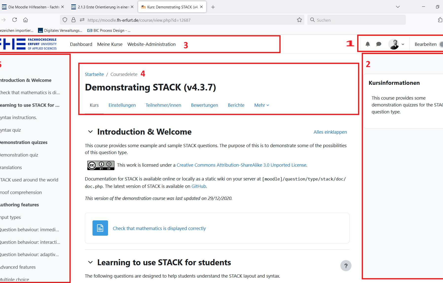 - 1 und 3 Kopfbereich: Enthält den Kursnamen, das Menü und die Teilnehmerliste.Die Zahlen 1 und 3 in der Abbildung zeigen den Kopfbereich. 3 Ist hierbei die Steuerung von Moodle, 1 betrifft die Suche und die persönlichen Informationen wie den eigenen Account.