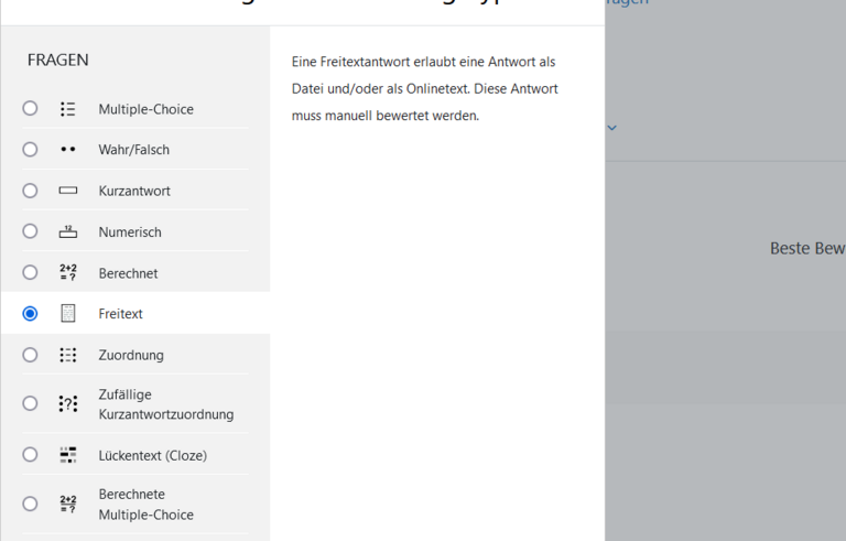 Freitext: Offene Antworten, die manuell bewertet werden.