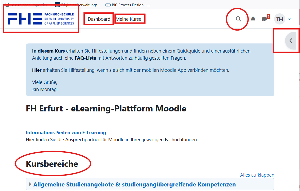 - Benachrichtigungen: Wichtige Mitteilungen von Moodle oder Ihren Kursen.