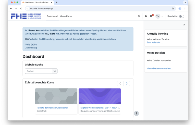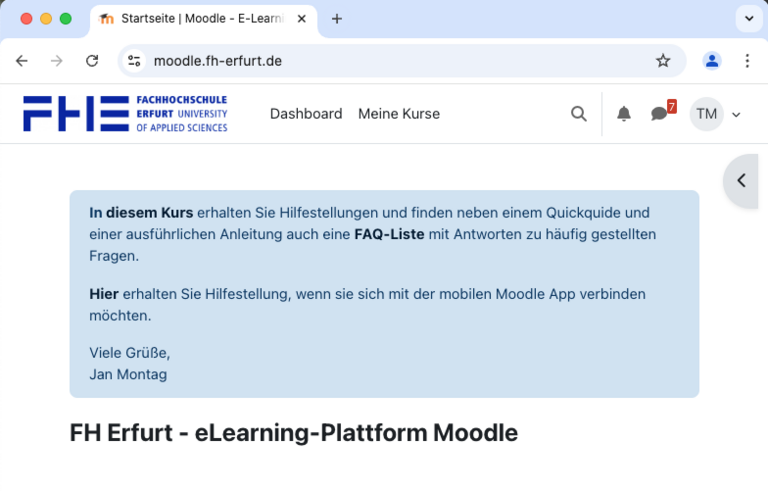 Nach dem erfolgreichen Login auf moodle.fh-erfurt.de gelangen Sie direkt auf die Startseite der Moodle-Instanz, erreichbar auch immer über das FHE-Logo (links), neben dem persönlichen Dashboard. Moodle ist Ihre zentrale Lernplattform, auf der Sie Kurse besuchen, Materialien herunterladen, Abgaben einreichen und mit Lehrenden sowie Mitstudierenden kommunizieren können.