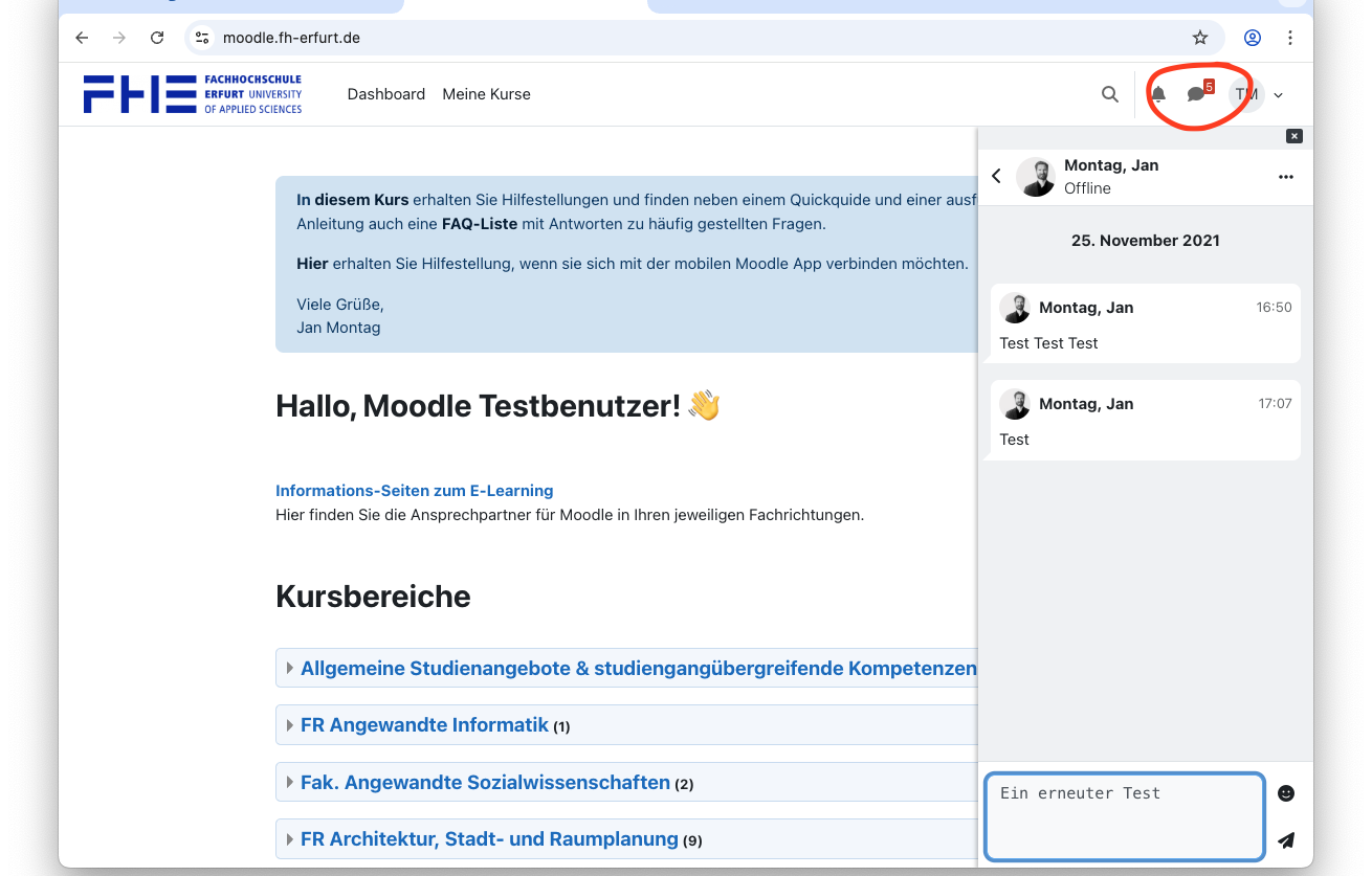 Die integrierte Nachrichtenfunktion in Moodle ermöglicht den direkten Austausch mit anderen Studierenden oder Lehrenden. Dies ist hilfreich für kurze Rückfragen oder persönliche Absprachen.