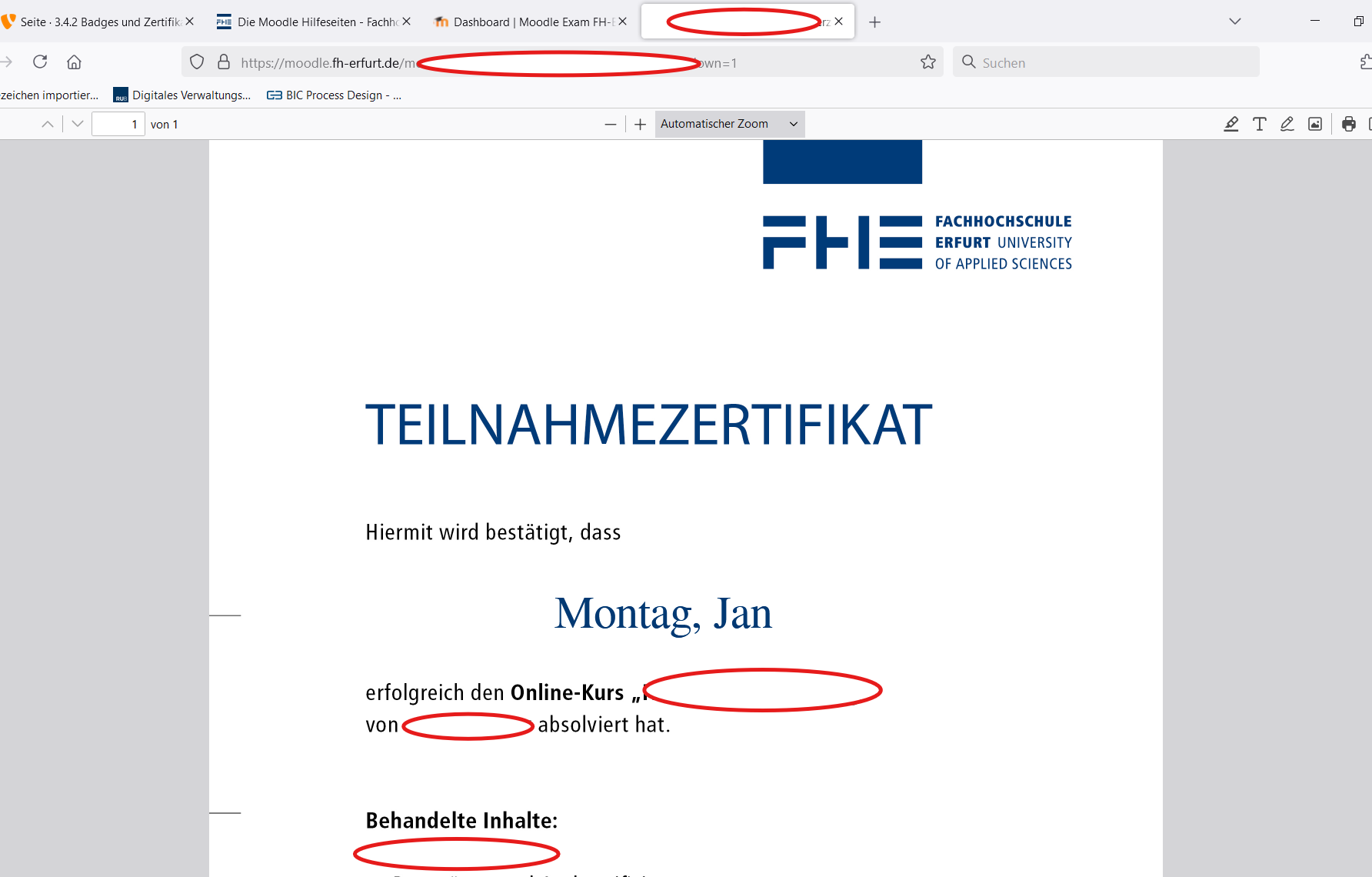 Einige Moodle-Kurse vergeben Zertifikate als Nachweis für Ihre erfolgreiche Teilnahme. Diese können Sie herunterladen und für Bewerbungen oder Weiterbildungen nutzen.