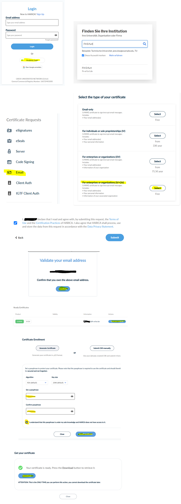 https://cm.harica.gr/Login - Wählen Sie beim Login-Fenster: