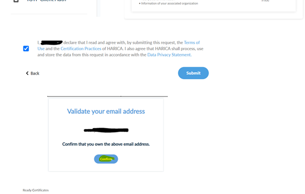 - Sie kopieren bitte den Link, der sich hinter dem "Confirm" Button verbirgt und fügen das in dem Browserfenster ein, wo Sie eben das Zertifikat beantragt haben und bestätigen Ihre E-Mail-Adresse mit dem Klick auf "Confirm" im Browser.